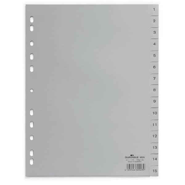 Przekładki A4 wykonane z PP nadrukowane indeksy 1-15 szare 15 części 652410