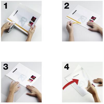 3. Przednią okładkę zagnij na lewą stronę, aby samoprzylepny pasek pokrył spięty brzeg. Mocno przyciśnij!