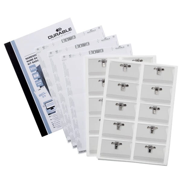 - W skład zestawu wchodzi: 20 identyfikatoroacute;w typu kombi-klip, 3 arkusze z etykietami (12 identyfikatoroacute;w/arkusz)