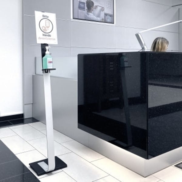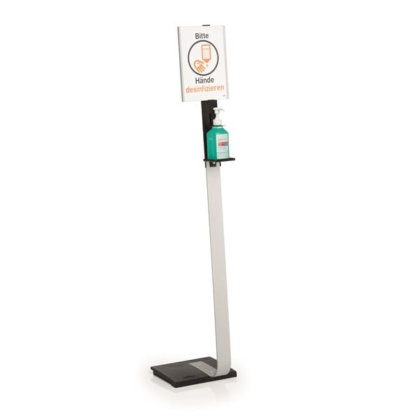 - Solidny i wysokiej jakości dozownik środków dezynfekujących jako mobilny, wolnostojący stojak podłogowy z aluminiowym panelem informacyjnym