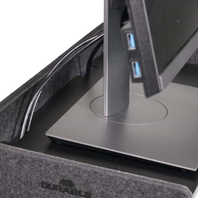 - Zintegrowane wyjścia zapewniają łatwe zarządzanie kablami, co umożliwia zachowanie porządku na biurku