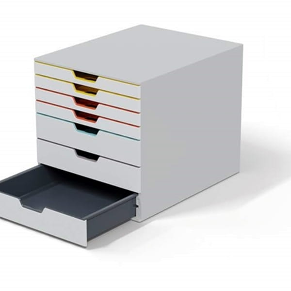 - Pojemnik z 7 kolorowymi szufladami umożliwiający segregację i łatwą orientację w dokumentach; z 3 wysokimi i 4 niskimi szufladami
