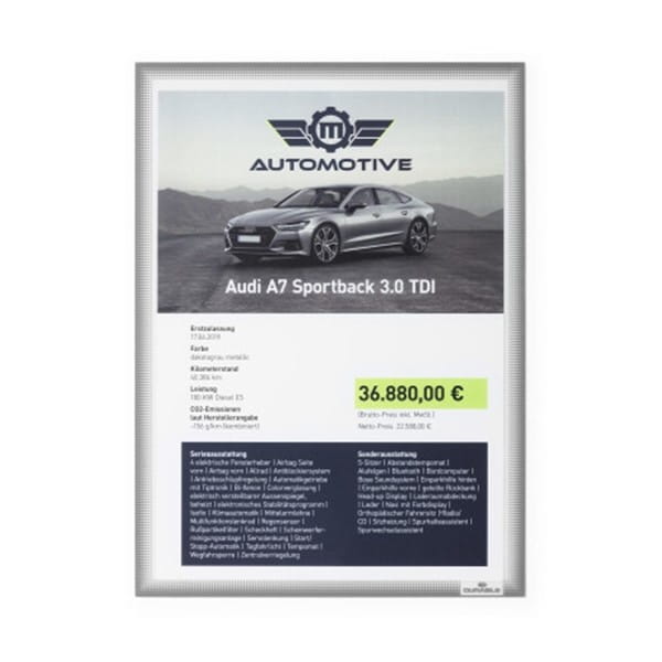 - Ramka dająca możliwość przytwierdzania informacji do wewnętrznych szklanych powierzchni, w tym również zakrzywionych, takich jak np. szyby samochodowe Na dokumenty w formacie A4, np. oferty